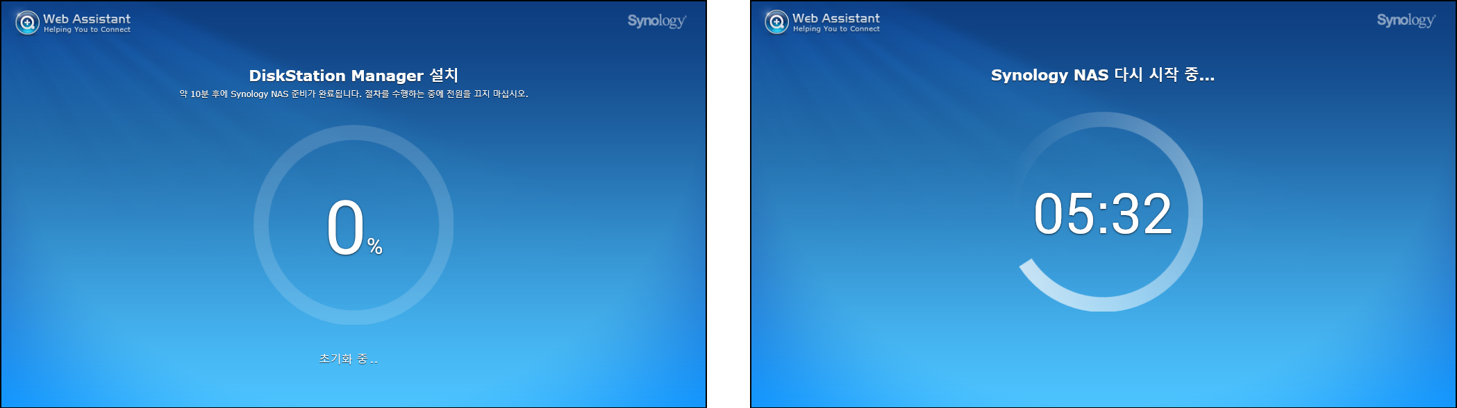 좌측은 DSM(운영체제) 설치내용이며 우측은 설치가 완료되고 다시시작 중입니다.