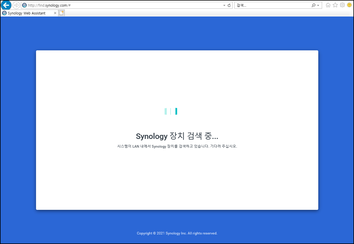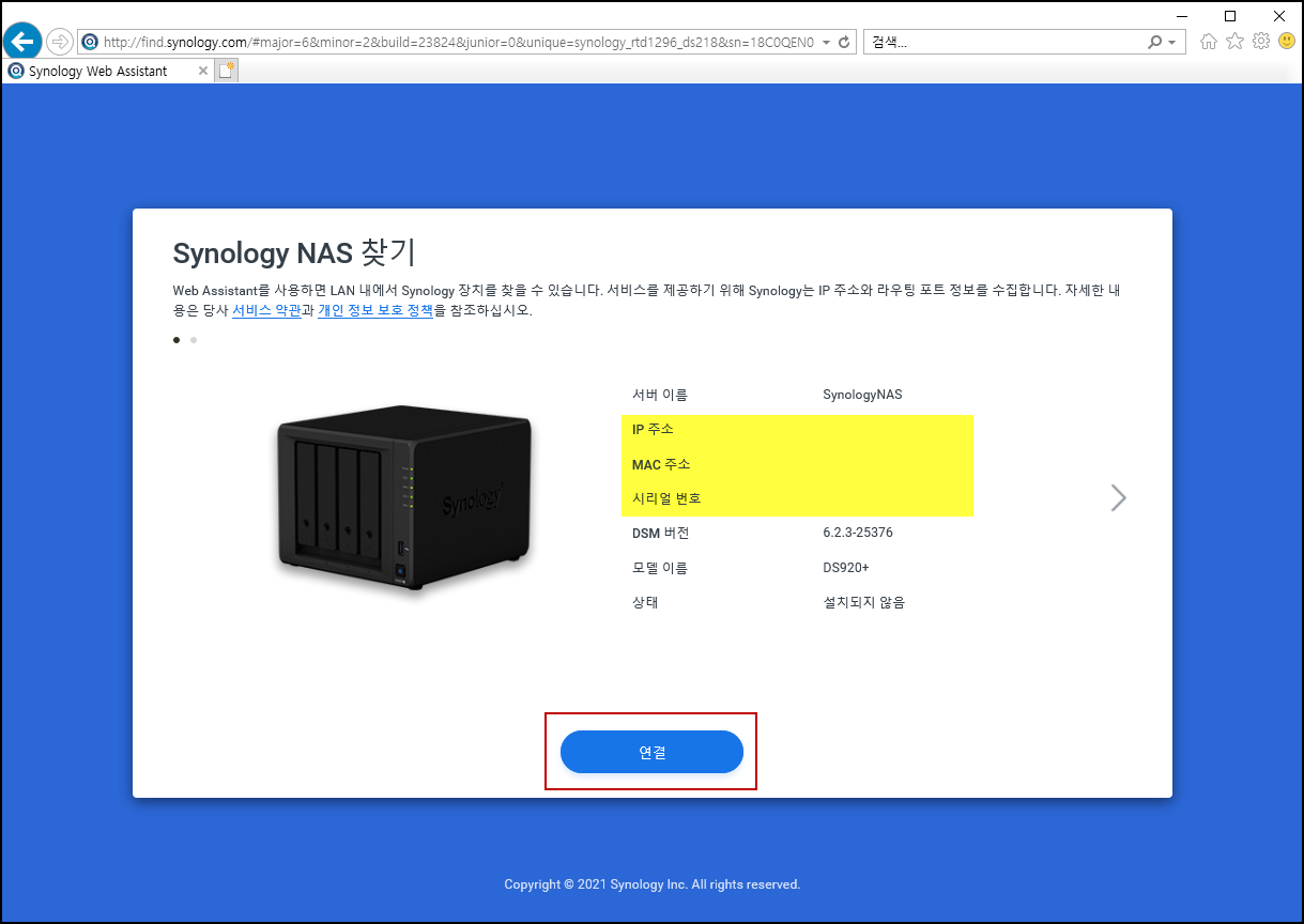 Synology NAS 연결하신 후 브라우저에서 find.synology.com 으로 접속하시면 현재 연결되어 있는 NAS를 검색하게 됩니다.