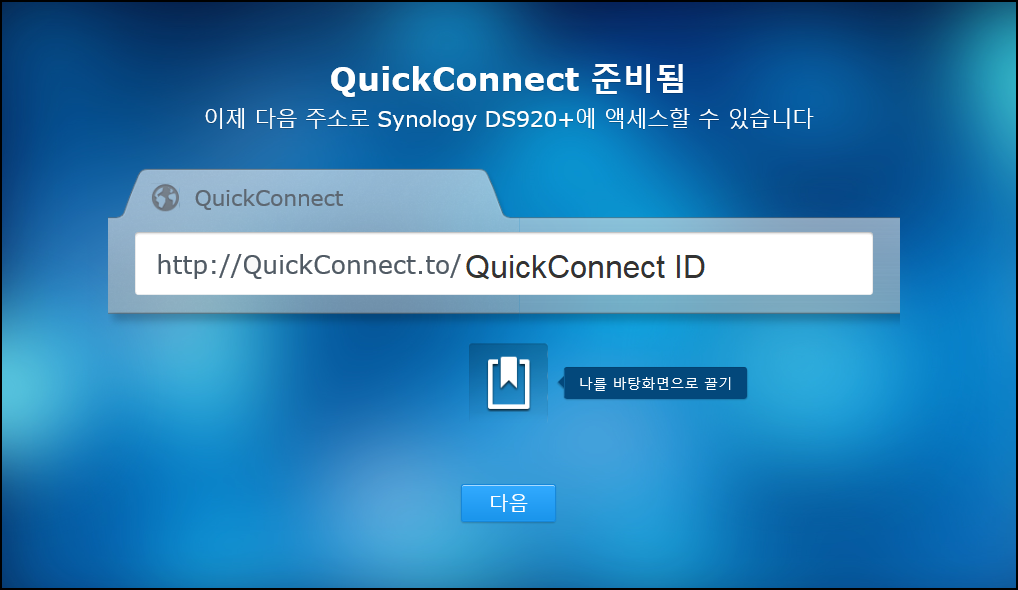 QuickConnect ID란? 복잡한 네트워크 구성을 하지 않고 QuickConnect.to/[QuicConnect 를 입력하여 손쉽게 사용자 지정 주소를 통해 접속하는 URL 입니다.