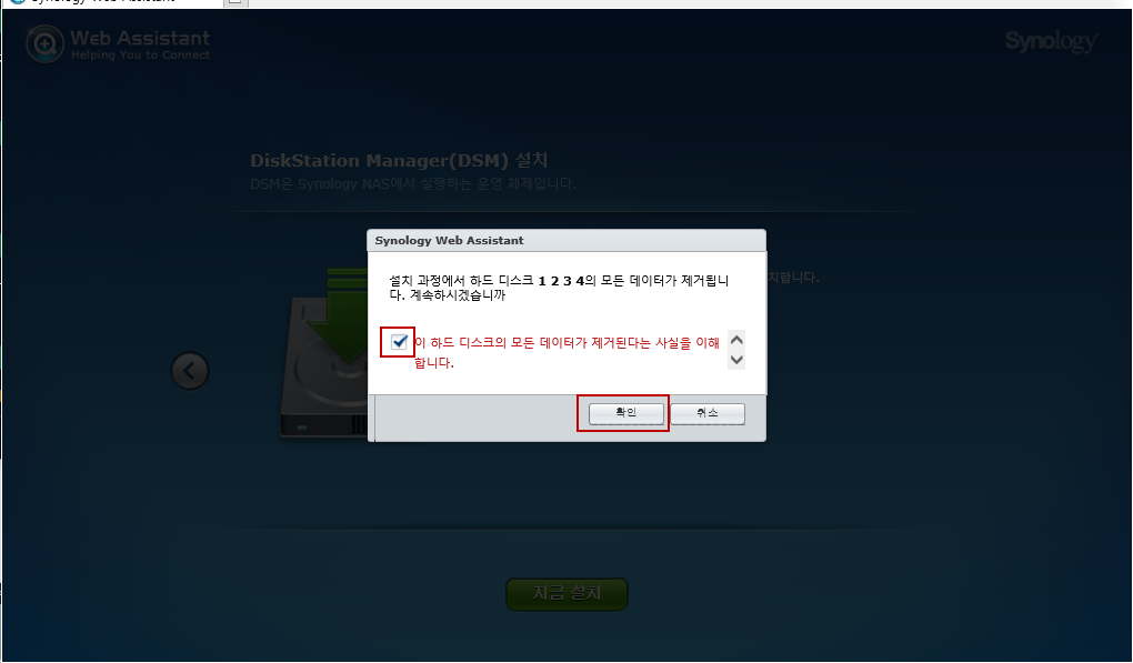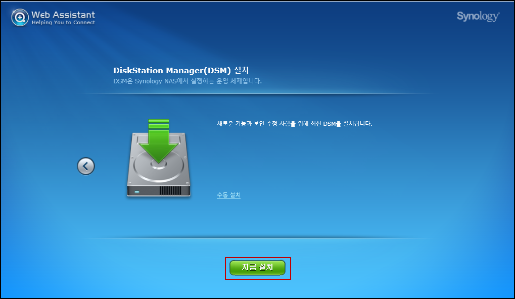 Synology NAS DSM(운영체제) 설치 부분입니다 지금 설치를 선택합니다.
