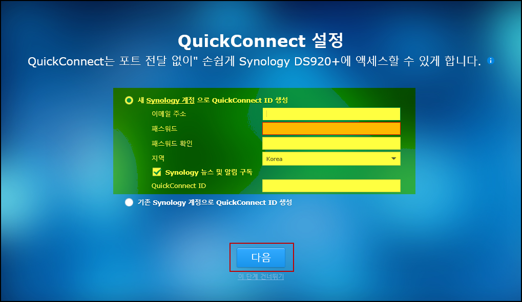 Synology 계정이 없으신 분은 계정 생성하시고 다음을 선택합니다.