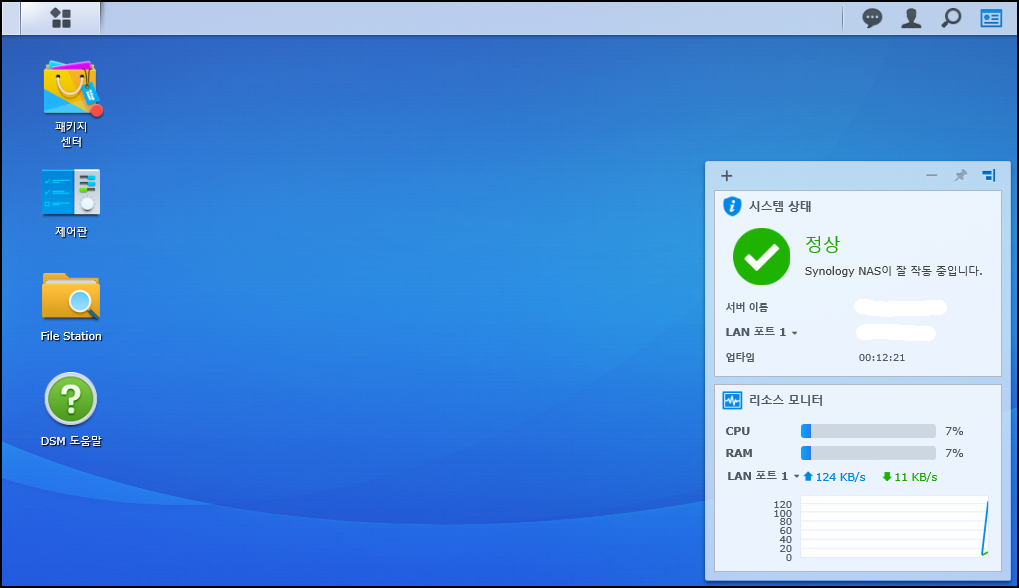 Synology NAS 설치가 모두 완료되고 메인페이지 입니다.