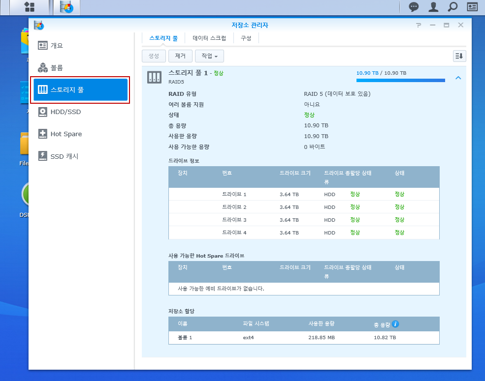 좌측 스토리지 풀을 선택하시면 레이드 구성을 확인하실 수 있습니다.