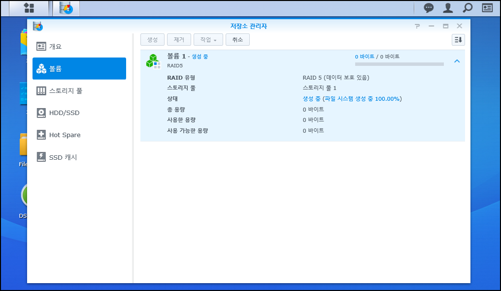 RAID 구성작업이 완료되었으며, NAS에서 RAID 구성 작업을 진행하게 됩니다.