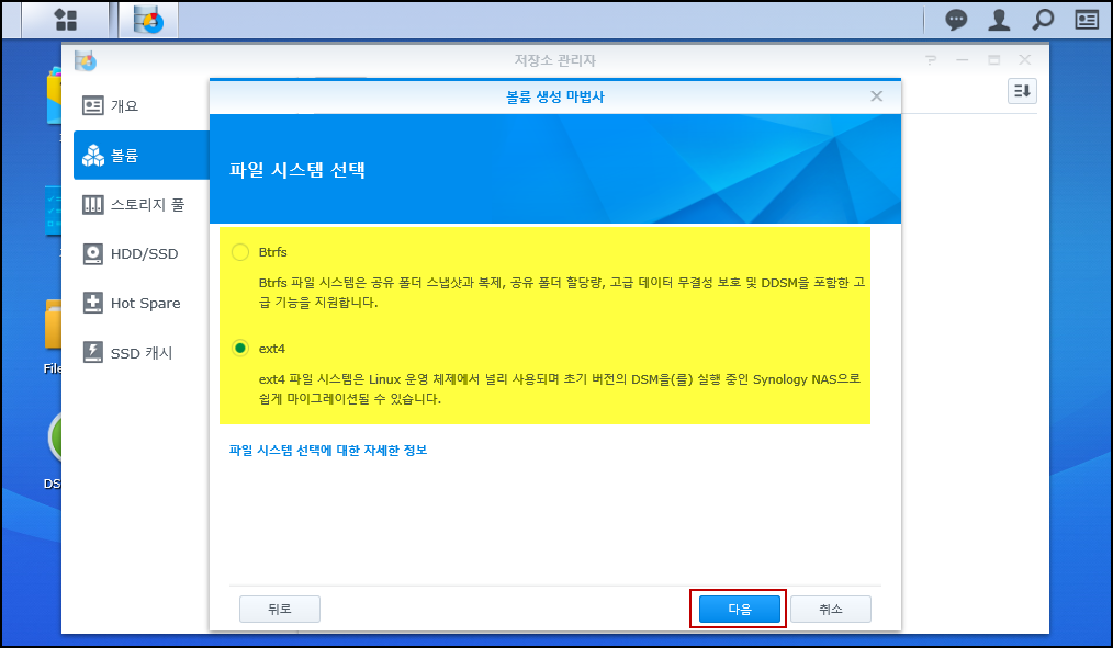 원하시는 파일시스템을 체크하고 다음을 선택합니다.