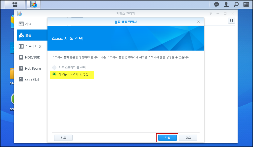 스토리지 풀 선택이며, 새로운 스토리지 풀을 생성을 체크하고 다음을 선택합니다.
