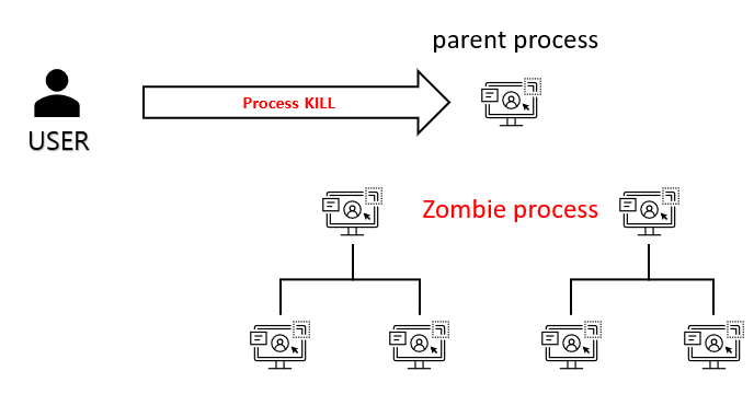 부모 프로세스가 종료되면 자식 프로세스도 같이 종료되지만 간혹 부모 프로세스가 종료된 후에도 자식 프로세스가 종료되지 않으면 좀비 프로세스(Zombile Process)라고 하며, 이러한 경우 Kill 명령어를 이용하여 PID를 직접 지정하여 종료해야 됩니다.