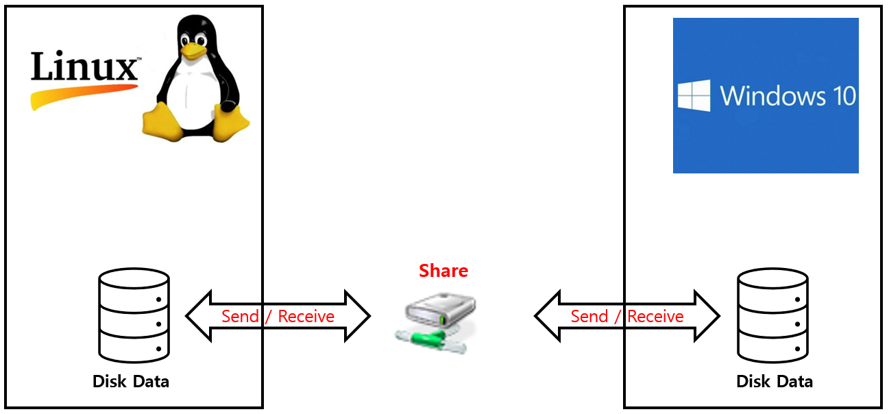 Linux 서버에서 Linux 서버끼리 파일을 공유할때 NFS(Network File System)를 이용하여 파일을 공유하며, Windows 서버에서 Windows 서버끼리 파일을 공유할때는 공유디렉토리를 이용하여 파일을 공유합니다