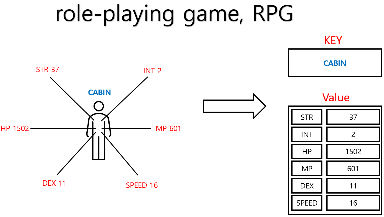 127.0.0.1:6379> HSET NAME:CABIN INT 2 DEX 11 BONUS 5 HP 1502 MP 601