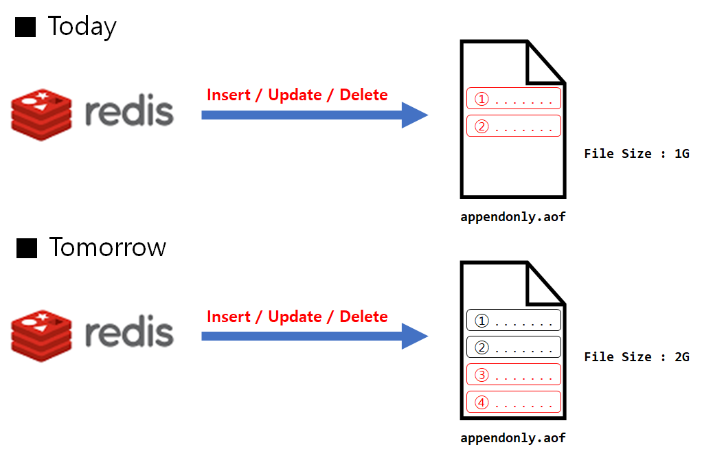 AOF 방식은 입력, 수정, 삭제의 명령을 실행 기록을 그대로 로그파일 기록하게 되므로 로그파일의 크기가 굉장히 커질 수 있습니다.