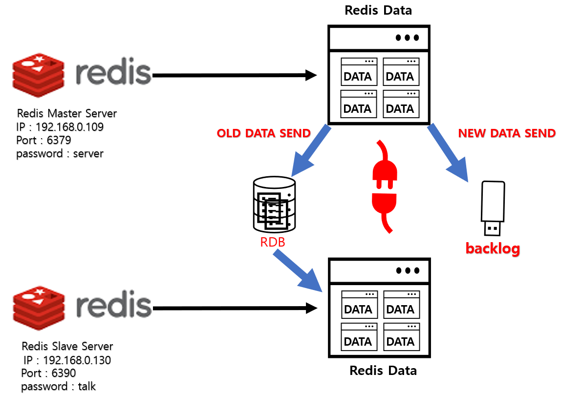 Master 서버는 RDB 파일의 Slave 서버에 전송후 Replication 버퍼인 backlog에 저장된 데이터를 Slave 서버로 전송하게 됩니다.
