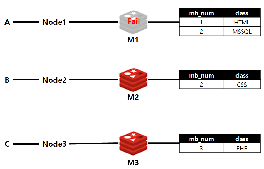 위 그림과 같이 3대의 Master가 구성되어 하게되면 데이터가 저장될때마다 M1, M2, M3 으로 순차적으로 변경하여 저장됩니다.