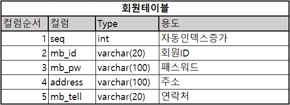 INSERT INTO member_table (mb_id, mb_pw, address, mb_tell) VALUE('nginx', 'server4', '경기도 안산시 단원구', '010-7891-1234');
