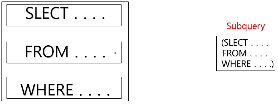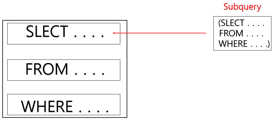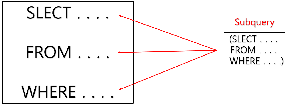 WHERE, HAVING 절에서 사용되는 서브쿼리를 중첩 서브 쿼리(Nested Subquery)라고 합니다.