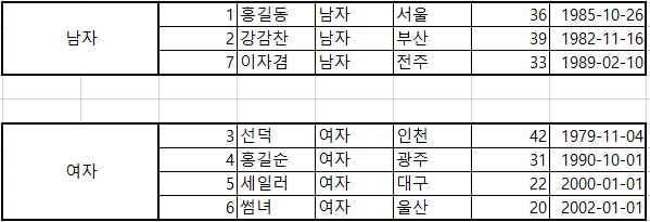 그룹하여 조회할 경우 남자, 여자 이렇게 2개의 데이터가 있는것처럼 보이게 됩니다