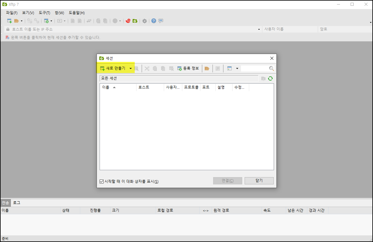 "Ctrl + o" 를 입력하시면 세션창이 표시되며, "새로 만들기"를 선택합니다