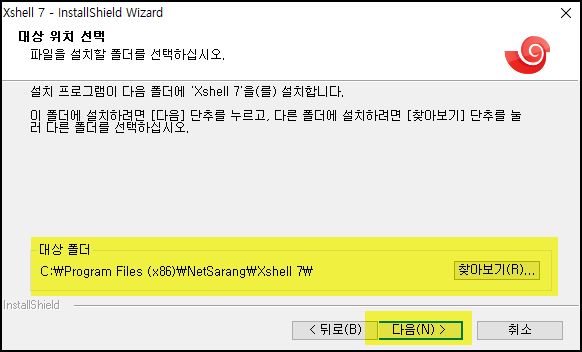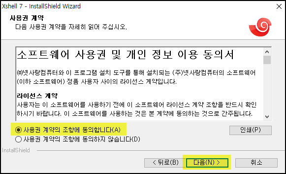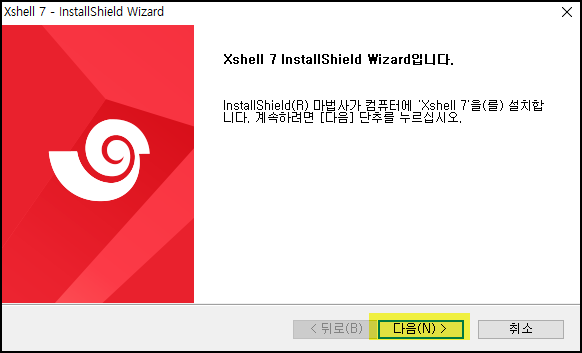 다운로드 받으신 XSHELL 를 실행하고 설치위자드에서 다음을 선택합니다.