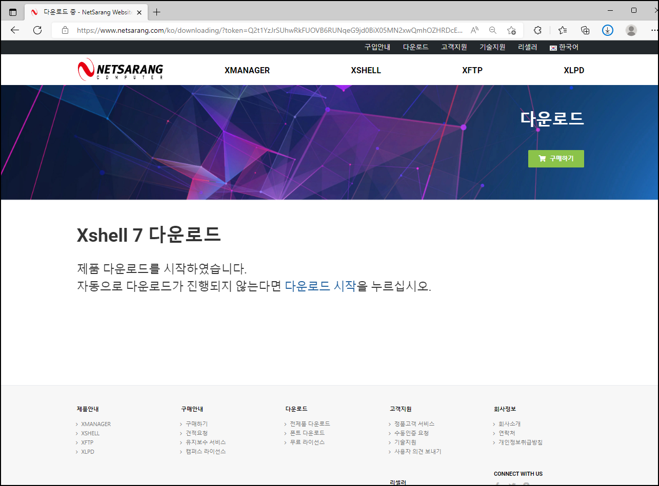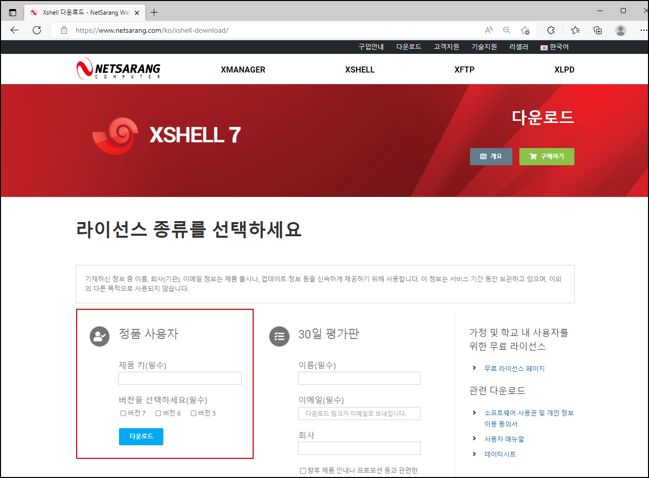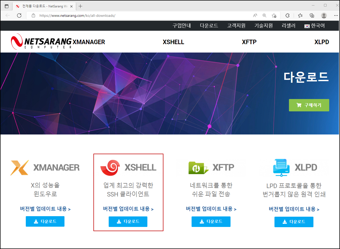 Netsarang 다운로드 페이지에서 XSHELL 다운로드 선택합니다.
