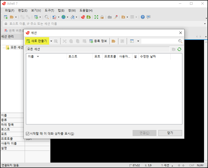 "Alt + o" 를 입력하시면 세션창이 표시되며, "새로 만들기"를 선택합니다
