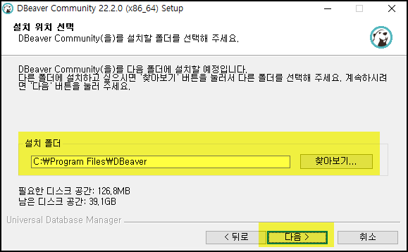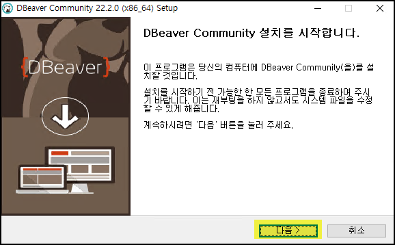 DBeaver 설치 안내페이지이며, 다음을 선택합니다.