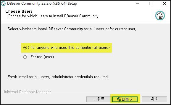 모든 사용자가 사용할수 있도록 all users를 선택하지만, 설치하는 계정만 사용하실 경우 user만 선택하셔도 됩니다.