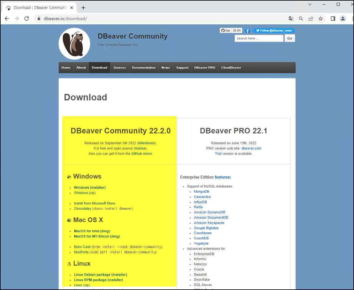 | 데이터베이스 관리도구 - DBeaver 다운로드 |