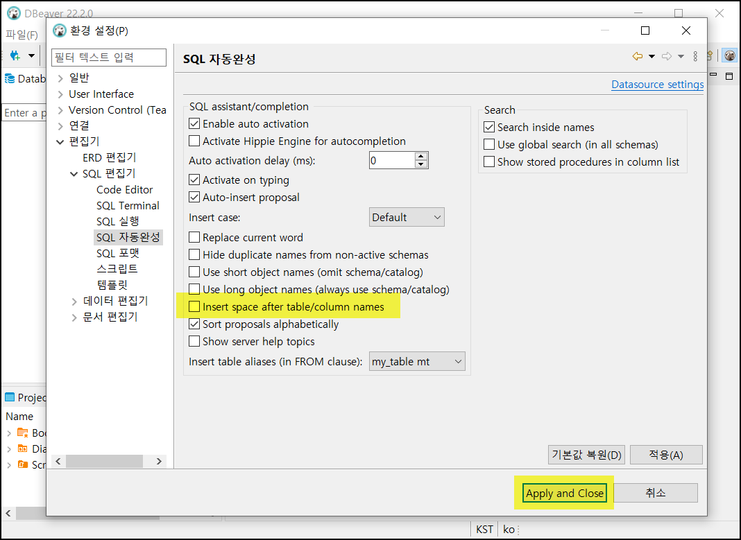 데이터베이스 관리도구 - DBeaver 테이블명 별칭 자동완성 끄기