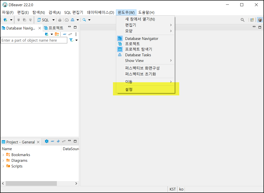 상단 탭에서 [윈도우] -> [설정] 을 선택합니다.