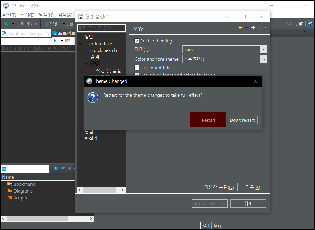 다크모드 변경에 따른 DBeave 재시작 부분이며 [Restart] 를 선택합니다.