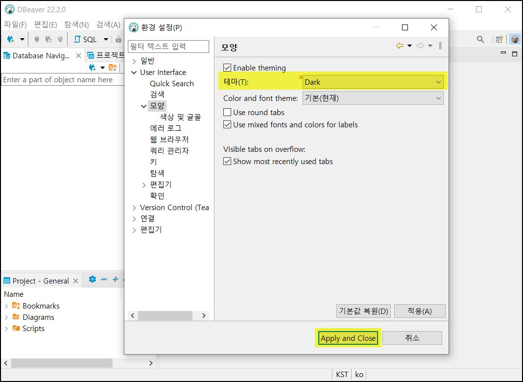 테마에서 "Dark" 변경후 [Apply and Close] 를 선택합니다.