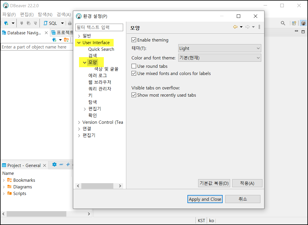 데이터베이스 관리도구 - dbeaver 다크모드 변경하기