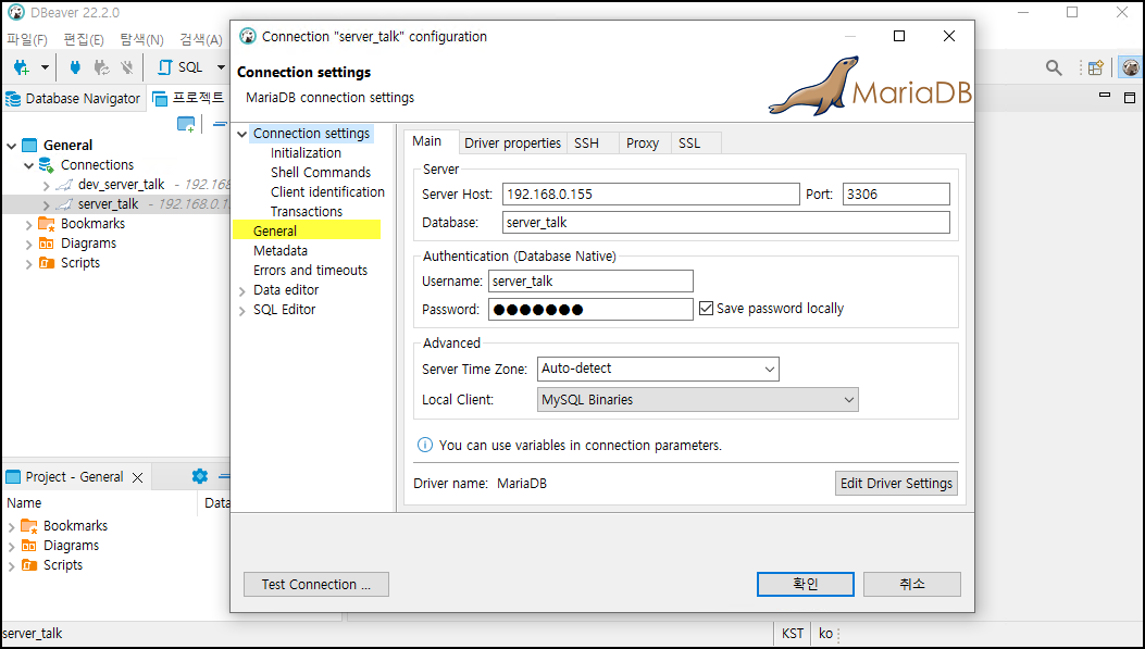 좌측 "General" 탭의 Connection type 에서 Development 을 지정하고 확인을 선택합니다.