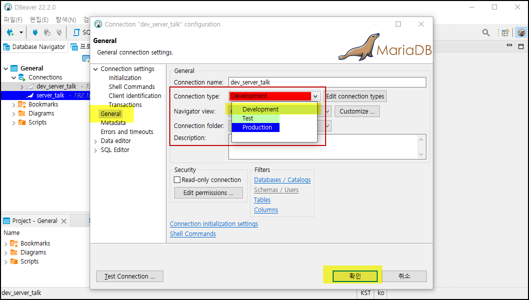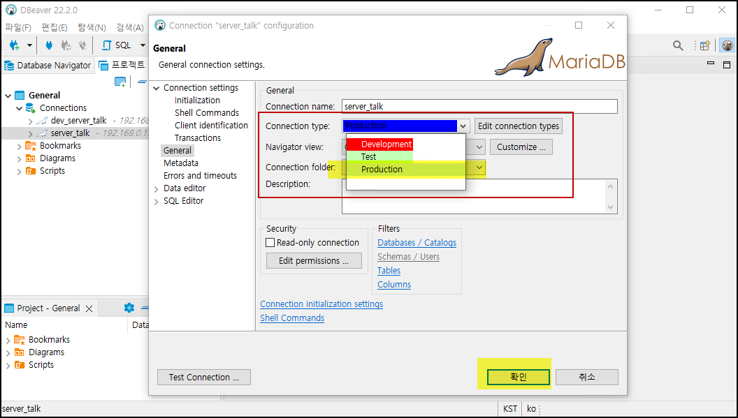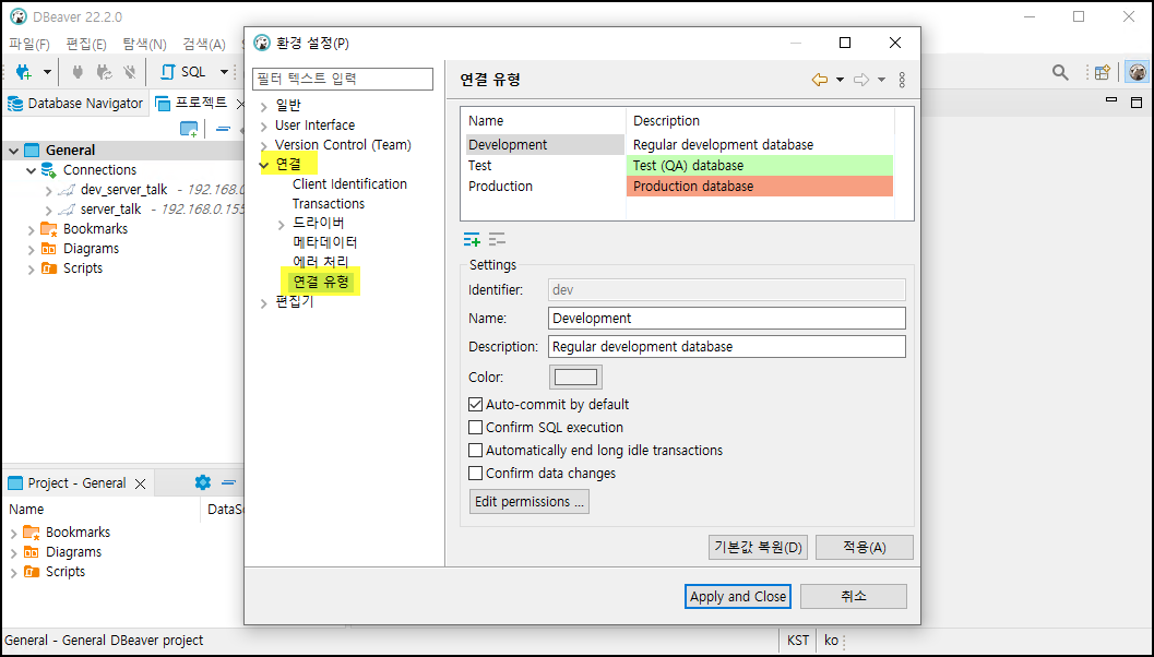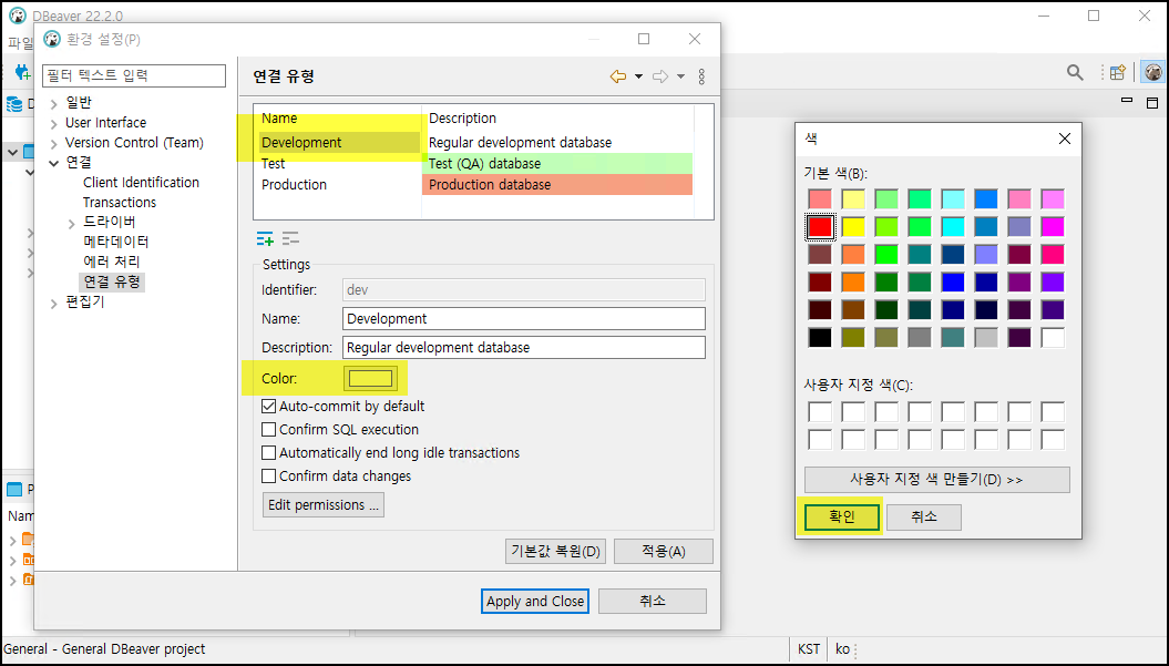 연결 유형중 Developent(개발DB), Test(테스트DB), Production(운영DB)의 종류가 있으며 각각의 연결 유형에 따라 색상을 지정할 수 있습니다.