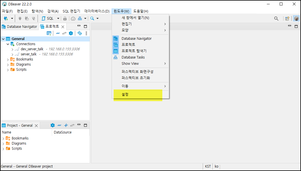 상단 탭에서 [윈도우] -> [설정] 을 선택합니다.