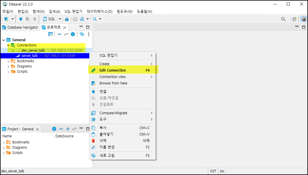 개발 DB의 우클릭후 "Edit Connection" 을 선택합니다.