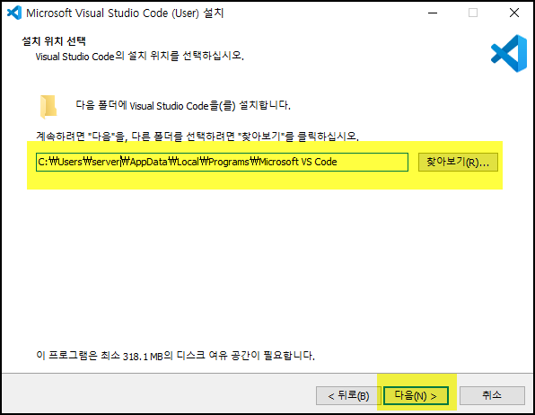 설치 우치 경로를 지정후 다음을 지정합니다.