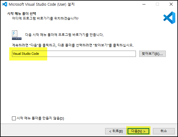 vscode 시작 메뉴 폴더 이름을 입력 하고 다음을 선택합니다.